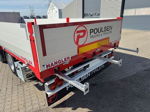 Her er der tale om en HANGLER kærre med 600mm aluminium-sider, som er udstyret med løse 12-tons alu-ramper. Kærren er forsynet med BPW aksler med tromlebremser, og den har en liftaksel på både aksel 1 og aksel 3. Trækstangen er forskydelig med mulighed for at låse den for hver 100mm, og dens længde kan justeres fra 1.800mm til 2.400mm.