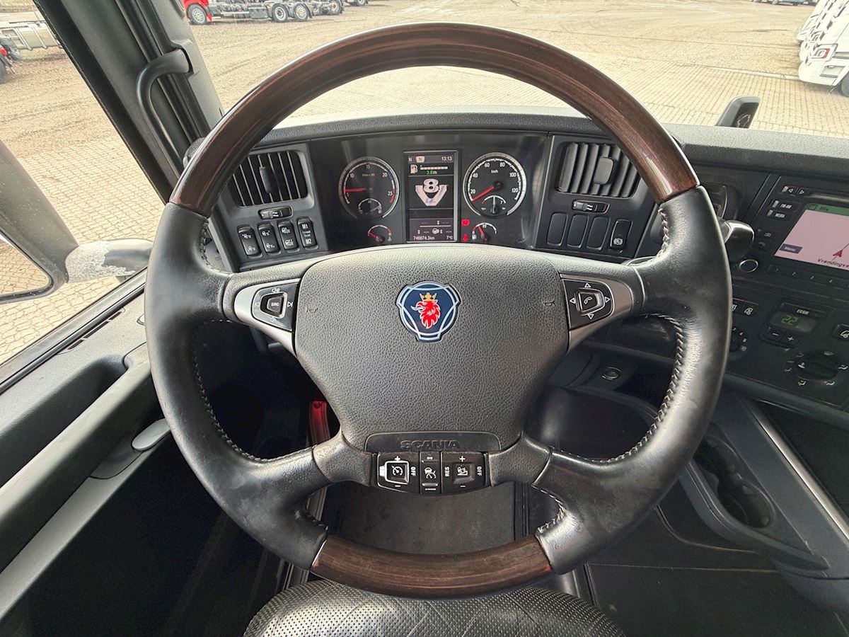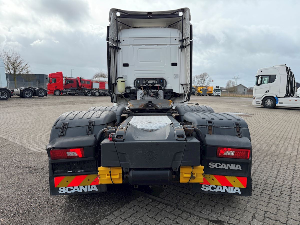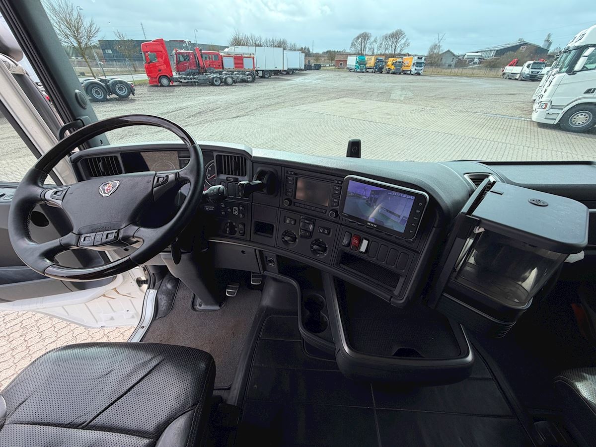 Denne Scania R580 6x4 tandemtrækker er udstyret med et hydraulikanlæg og alu‑dørk og er klar til krævende opgaver. Lastbilen har bakkamera og LED‑arbejdslys, som giver godt overblik og sikkerhed ved manøvrering. Den forskydelige skammel gør det nemt at tilpasse trækket til forskellige typer trailere.